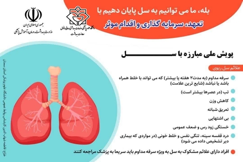 اگر سرفه بیش از دو هفته همراه با خستگی مفرط، کاهش وزن بی دلیل یا تعریق شبانه دارید، بدون ترس و نگرانی در طول پویش ملی مبارزه با سل (۲۳ تا ۳۰ مهر) جهت انجام مشاوره و دریافت خدمات رایگان بیماری سل به به نزدیک‌ترین مرکز خدمات جامع سلامت مراجعه نمایید. ����شماره تماس: ۰۶۱۴۲۲۳۰۰۸۰
