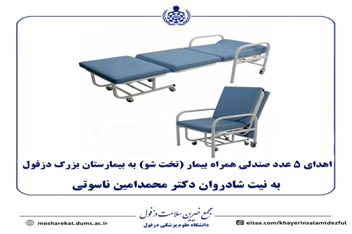 پنج عدد صندلی همراه بیمار (تخت شو) به نیت شادروان دکتر محمدامین ناسوتی  به بیمارستان بزرگ دزفول (گنجویان) اهدا شد.