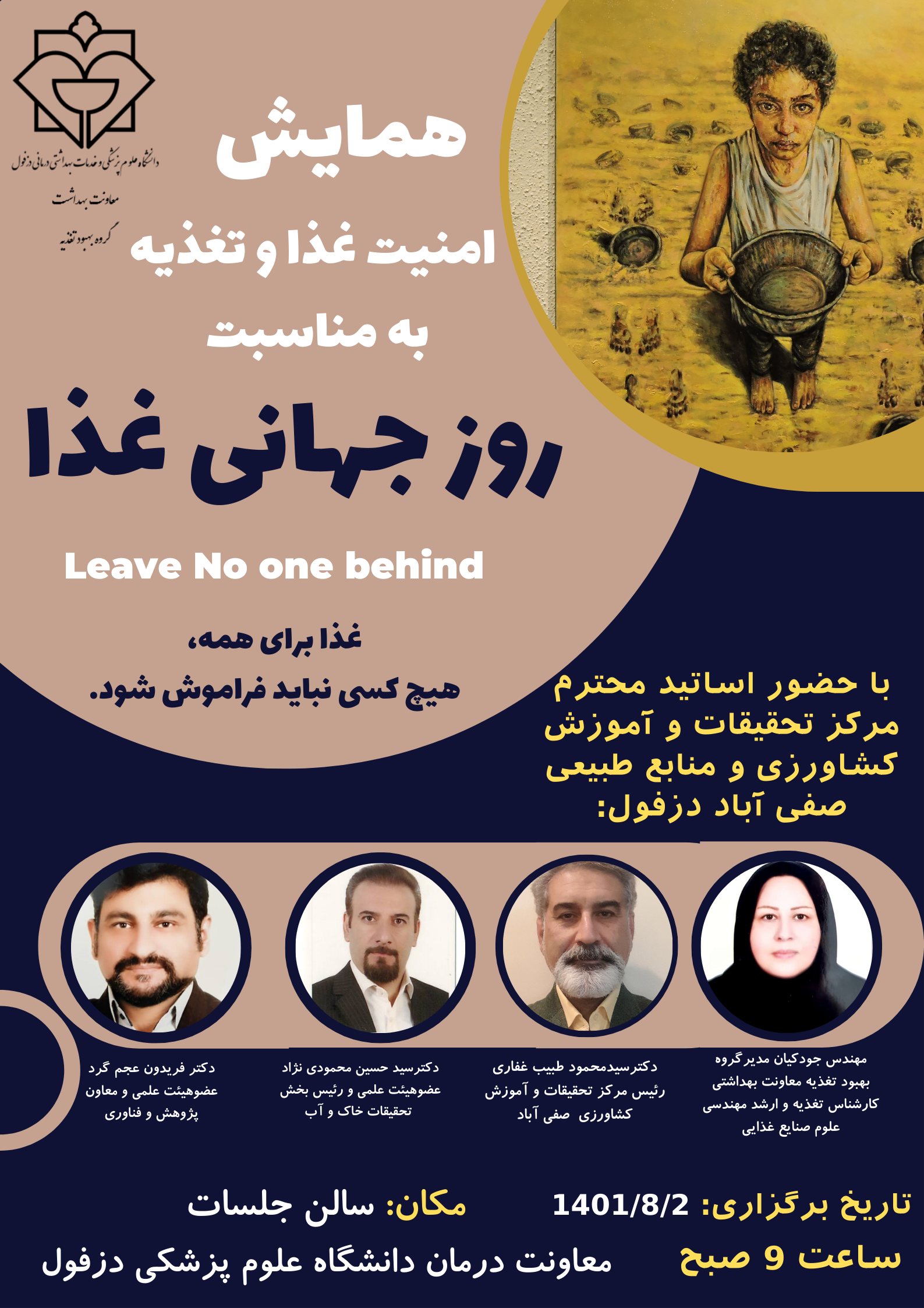 وی افزود: روز جهانی غذا مقارن 16 اکتبر می باشد که به افتخار تاسیس سازمان فائو در سال 1945 نامگذاری شده و در سراسر جهان گرامی داشته می شود، این روز توسط بسیاری از سازمان های مرتبط با امنیت غذایی به شیوه های مختلف برگزار می گردد. به همین مناسبت مطابق با سالهای گذشته و بر اساس شعار این روز در معاونت بهداشت با رویکرد امنیت غذایی نشست صمیمی برگزار گردید.