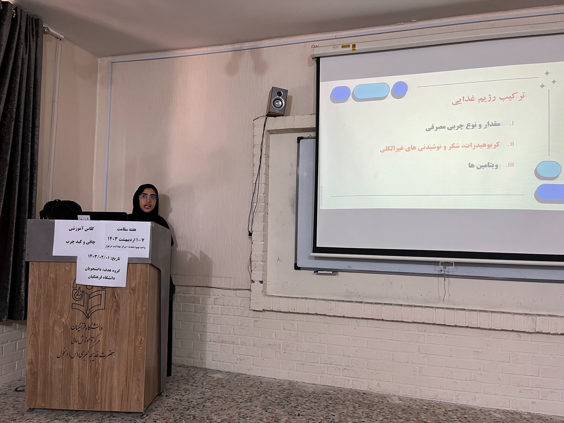 مسئول واحد بهبود تغذیه مرکز بهداشت دزفول خبر داد: در هفته ملی سلامت که از یکم اردیبشهت آغاز و تا هفتم همین ماه ادامه یافت، برنامه های مختلفی توسط این واحد در سطح شهرستان به انجام رسید. زینب رفعت پناه انجام مشاوره های فردی، برگزاری ایستگاه های سلامت، اندازه گیری قد و وزن، مشاوره های رژیم درمانی، حضور در نمایشگاه سلامت فرهنگسرای کوی آیت اله مدرس .. از مداخلاتی است که در طول هفته ملی سلامت اجرا شد. رفعت پناه در خاتمه گفت: دانش آموزان، دانشجویان، طلاب، شاغلین در ادارات و صنایع و سایر گروه ها سنی مانند میانسالان، سالمندان و مادران باردار از جمله گروه های هدفی بودند که از این خدمات ارائه شده، بهره مند شدند.