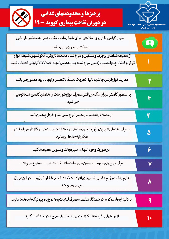 پرهیزها و محدودیتهای غذایی در دوران نقاهت بیماری کووید19(پوستر)