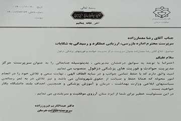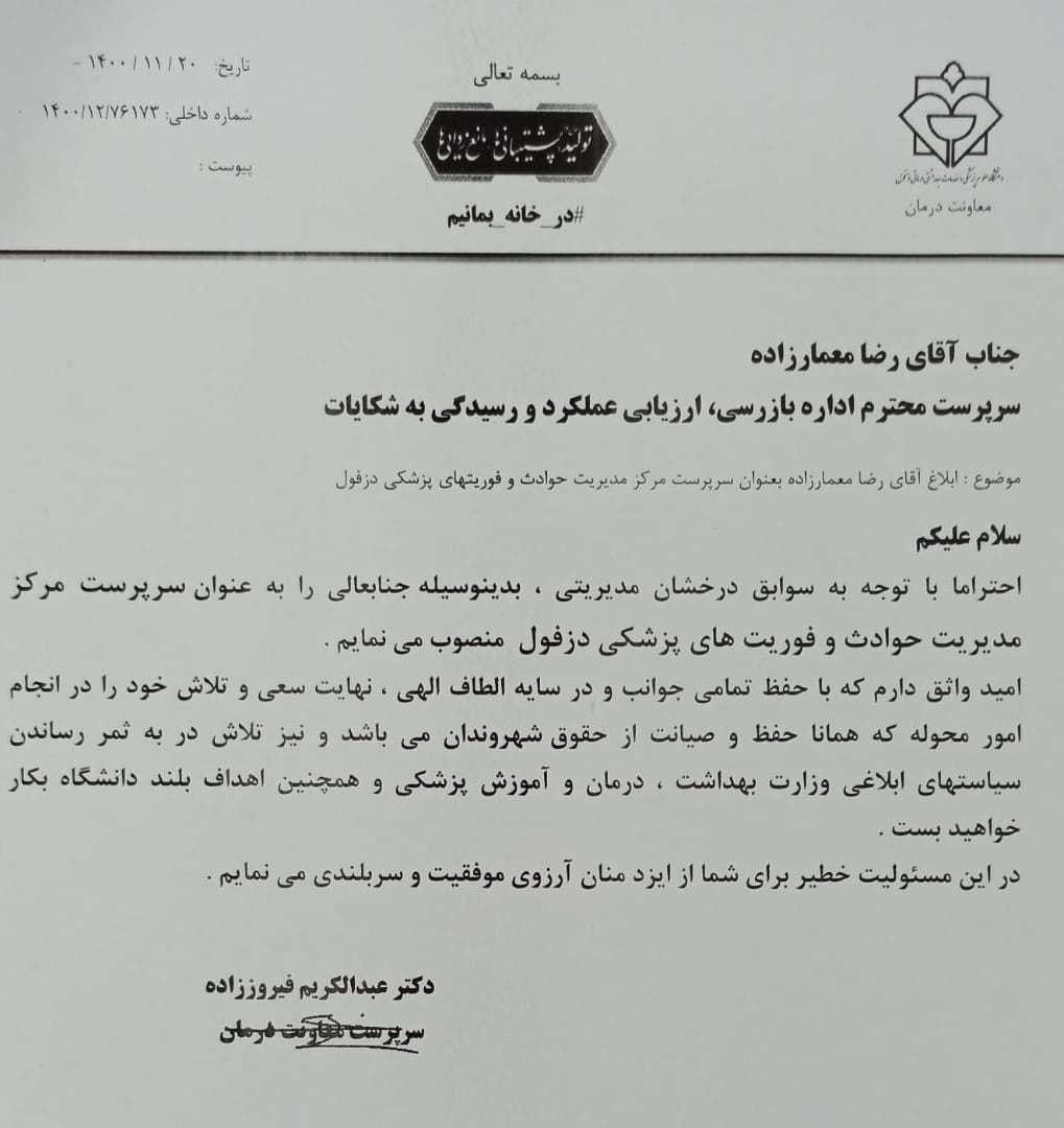 با ابلاغ سرپرست معاونت درمان دانشگاه علوم پزشکی دزفول