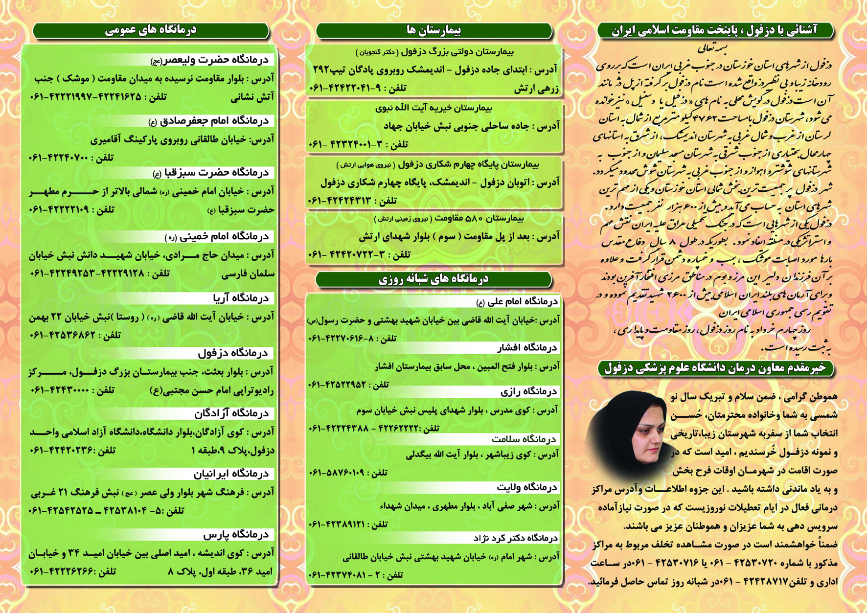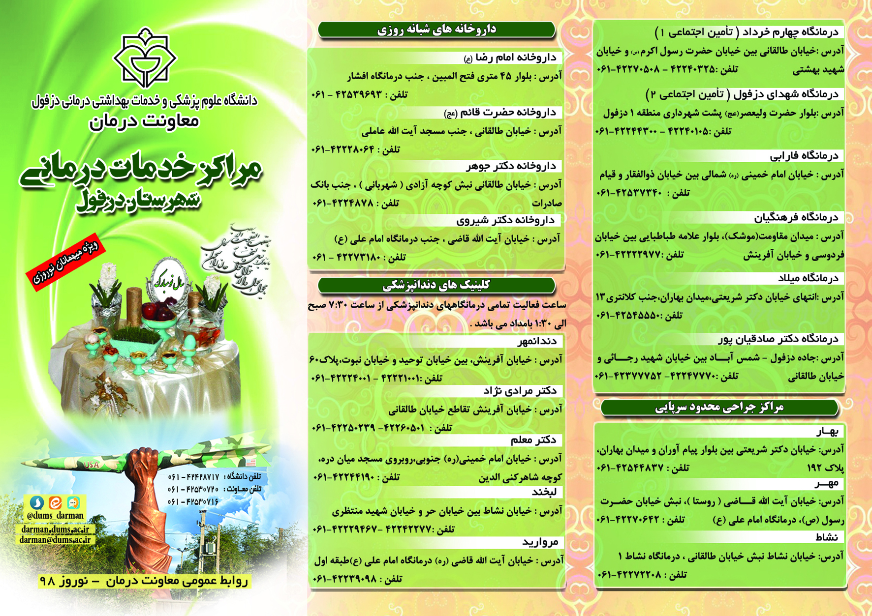 مهندس زمانی راد افزود: همچون سالهای گذشته برای میزبانی از میهمانان نورزی در سال 98،معاونت درمان دانشگاه علوم پزشکی دزفول اطلاعاتی شامل نام،آدرس و شماره های تماس تمامی مراکز درمانی فعال در شهرستان دزفول اعم از بیمارستان ها،درمانگاههای شبانه روزی و عمومی،مراکز جراحی محدود،کلینیک های دندانپزشکی و داروخانه های شبانه روزی در بروشوری تحت عنوان «مراکز خدمات درمانی شهرستان دزفول» طراحی و به چاپ رسانیده است.