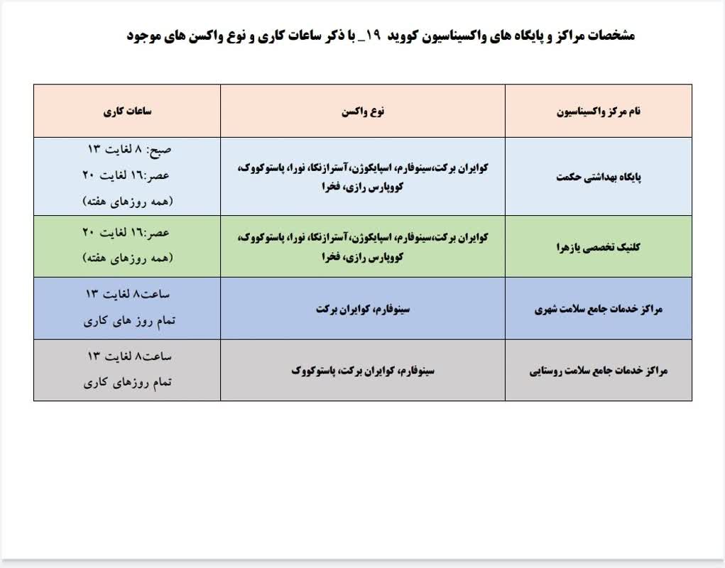 همشهریان نسبت به دریافت دوز یادآور خود اقدام کنند+ مشخصات مراکز و پایگاه های واکسیناسیون کووید 19 با ذکر ساعات کاری و نوع واکسن موجود