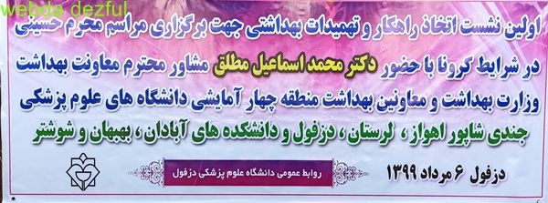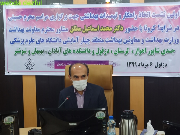 این نشست که برای اولین بار در کشور در منطقه چهار آمایشی و در دانشگاه علوم پزشکی دزفول صبح امروز برگزار شد تحت عنوان اولین نشست اتخاذ راهکارها و تمهیدات بهداشتی جهت برگزاری مراسم محرم حسینی در شرایط کرونا با حضور دکتر محمد اسماعیل مطلق مشاور بهداشت معاونت بهداشت وزارت بهداشت بود و معاونین بهداشت دانشگاههای علوم پزشکی جندی شاپور اهواز، لرستان، دزفول، آبادان، بهبهان و شوشتر حضور داشتند.