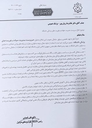 ا ابلاغ رئیس دانشگاه علوم پزشکی دزفول دکتر غلامرضا روان پور سرپرست مدیریت حوادث و فوریت های پزشکی شد.