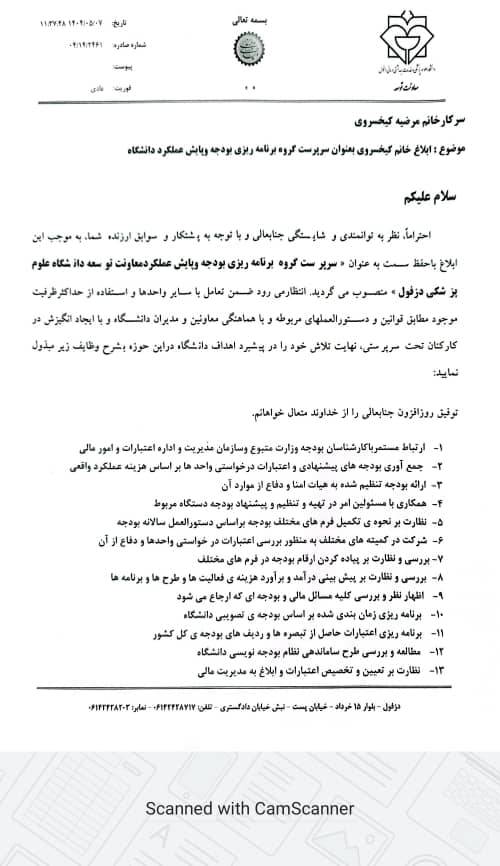 با ابلاغ معاون توسعه دانشگاه علوم پزشکی دزفول مرضیه کیخسروی به سرپرستی گروه برنامه ریزی بودجه و پایش عملکرد دانشگاه علوم پزشکی دزفول منصوب شد.