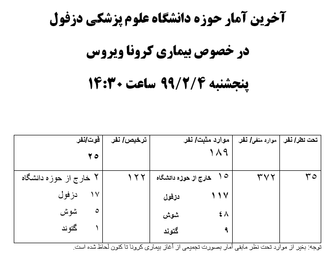 آخرین آمار حوزه دانشگاه علوم پزشکی دزفول در خصوص بیماری کروناپنجشنبه 4/2/99 ساعت 14:30