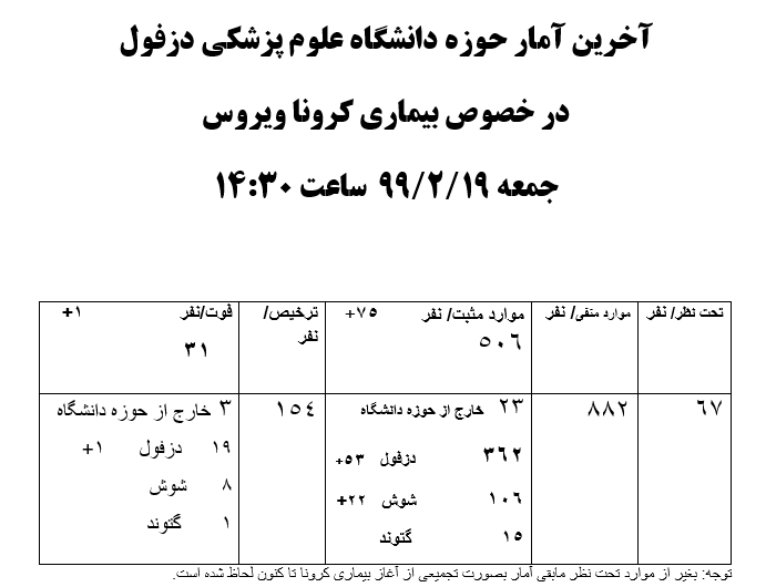آخرین آمار حوزه دانشگاه علوم پزشکی دزفول در خصوص بیماری کرونا جمعه 19/2/99 ساعت 14:30