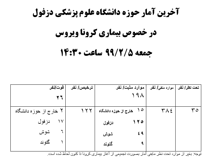 آخرین آمار حوزه دانشگاه علوم پزشکی دزفول در خصوص بیماری کرونا جمعه 5/2/99 ساعت 14:30