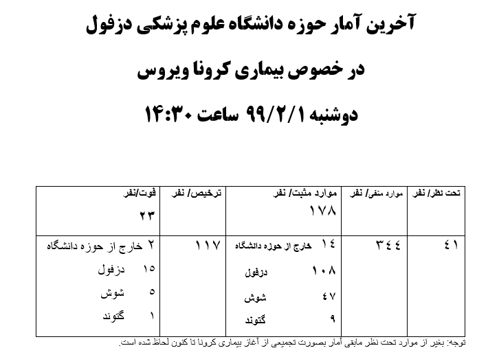 آخرین آمار حوزه دانشگاه علوم پزشکی دزفول در خصوص بیماری کرونا دوشنبه 1/2/99 ساعت 14:30