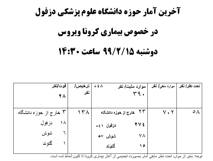 آخرین آمار حوزه دانشگاه علوم پزشکی دزفول در خصوص بیماری کرونا دوشنبه 15/2/99 ساعت 14:30