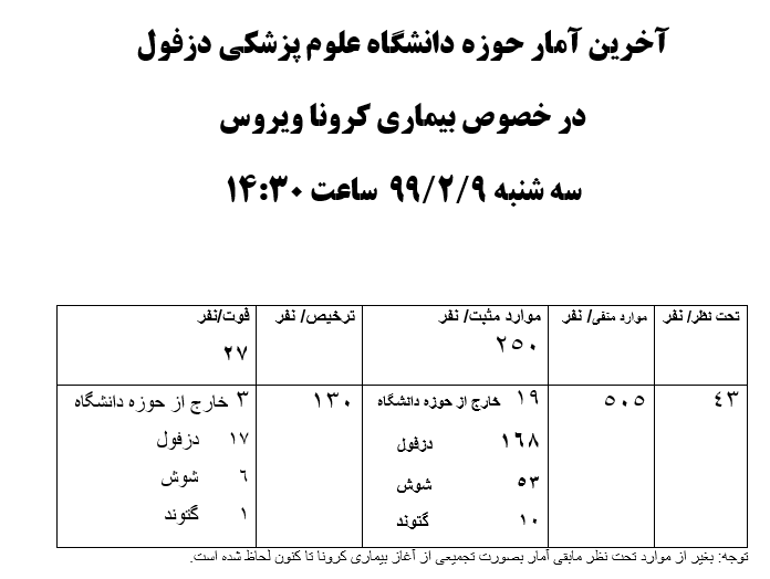 آخرین آمار حوزه دانشگاه علوم پزشکی دزفول در خصوص بیماری کرونا سه شنبه 9/2/99 ساعت 14:30