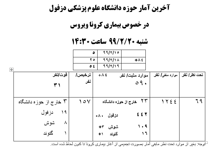 آخرین آمار حوزه دانشگاه علوم پزشکی دزفول در خصوص بیماری کرونا شنبه 20/2/99 ساعت 14:30