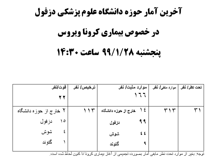 آخرین آمار حوزه دانشگاه علوم پزشکی دزفول در خصوص بیماری کرونا پنجشنبه 28/1/99 ساعت 14:30
