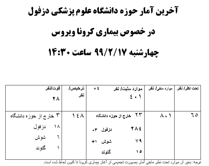 آخرین آمار حوزه دانشگاه علوم پزشکی دزفول در خصوص بیماری کرونا چهار شنبه 17/2/99 ساعت 14:30