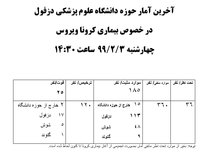آخرین آمار حوزه دانشگاه علوم پزشکی دزفول در خصوص بیماری کرونا چهار شنبه 3/2/99 ساعت 14:30