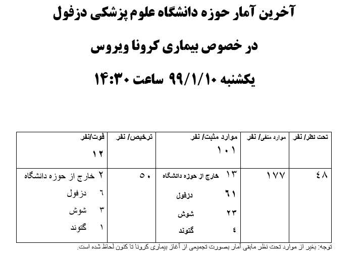 آخرین آمار حوزه دانشگاه علوم پزشکی دزفول در خصوص بیماری کرونا یکشنبه 10/1/99 ساعت 14:30