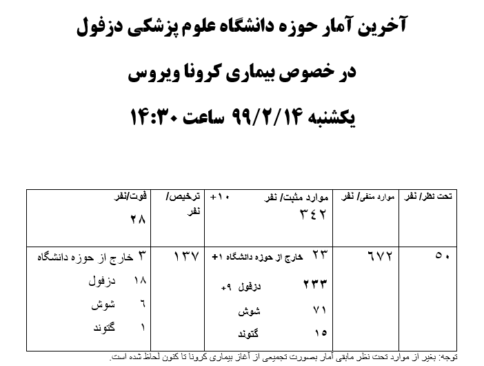 آخرین آمار حوزه دانشگاه علوم پزشکی دزفول در خصوص بیماری کرونا یکشنبه 14/2/99 ساعت 14:30