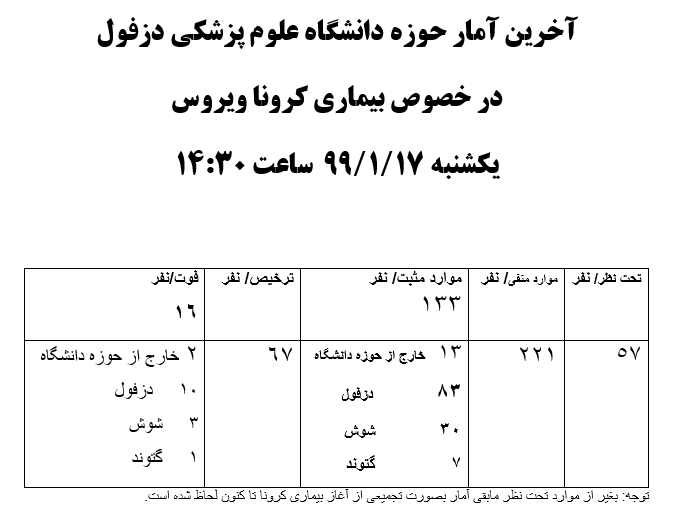 آخرین آمار حوزه دانشگاه علوم پزشکی دزفول در خصوص بیماری کرونا یکشنبه 17/1/99 ساعت 14:30