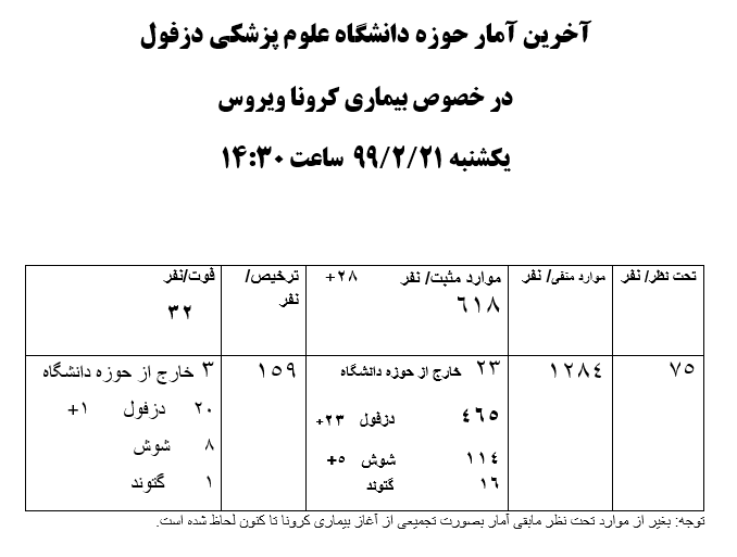 آخرین آمار حوزه دانشگاه علوم پزشکی دزفول در خصوص بیماری کرونا یکشنبه 21/2/99 ساعت 14:30