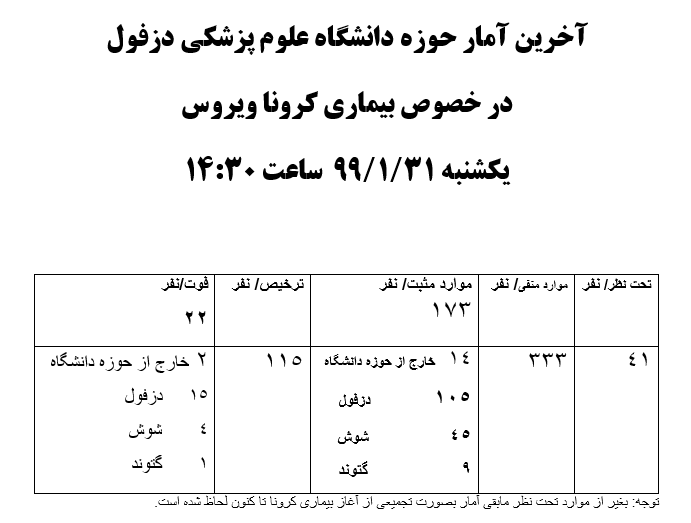 آخرین آمار حوزه دانشگاه علوم پزشکی دزفول در خصوص بیماری کرونا یکشنبه 31/1/99 ساعت 14:30