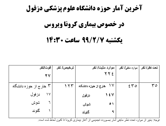 آخرین آمار حوزه دانشگاه علوم پزشکی دزفول در خصوص بیماری کرونا یکشنبه 7/2/99 ساعت 14:30