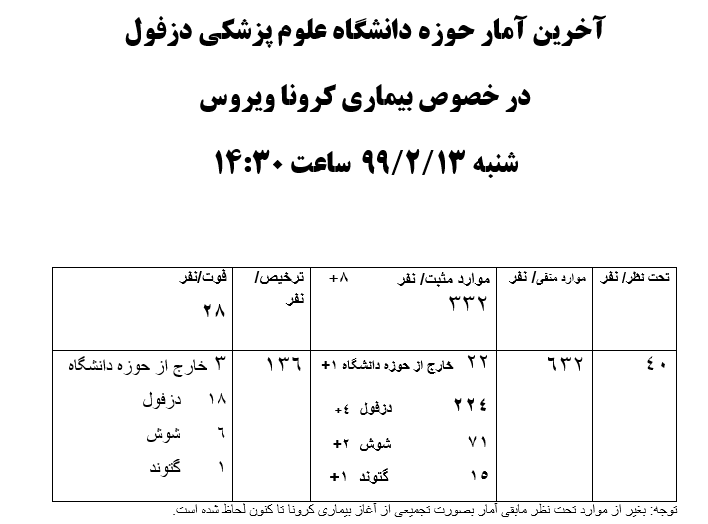 آخرین آمار حوزه دانشگاه علوم پزشکی دزفول در خصوص بیماری کرونا شنبه 13/2/99 ساعت 14:30