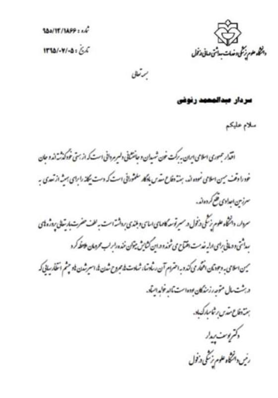 ظهر امروز سردار عبدالمحمد رئوفی فرمانده لشکر 7 ولیعصر (عج) در دوران هشت دفاع مقدس، استاندار اسبق کرمان و زنجان مهمان دانشگاه علوم پزشکی دزفول بود.
