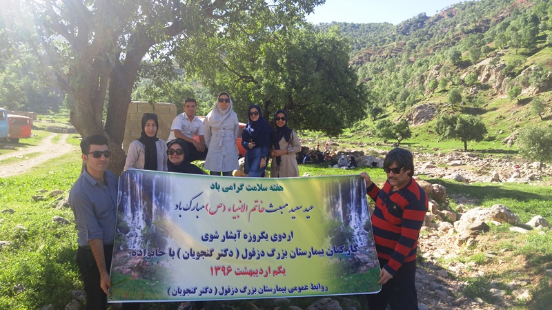 دراولین روزاردیبهشت بمناسبت گرامیداشت هفته سلامت ودرآستانه مبعث خاتم الانبیاء حضرت محمدص کارکنان بیمارستان بزرگ دزفول باخانواده درمنطقه گردشگری آبشارشوی یکروزشادومفرح راسپری کردند.