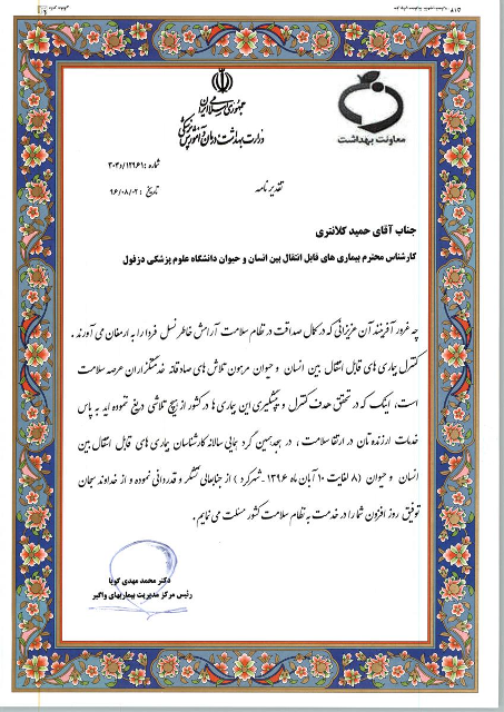 تقدیر ریاست مرکز مدیریت بیماریهای واگیر وزارت بهداشت از فعالیتهای گروه واگیر معاونت بهداشتی دانشگاه علوم پزشکی دزفول