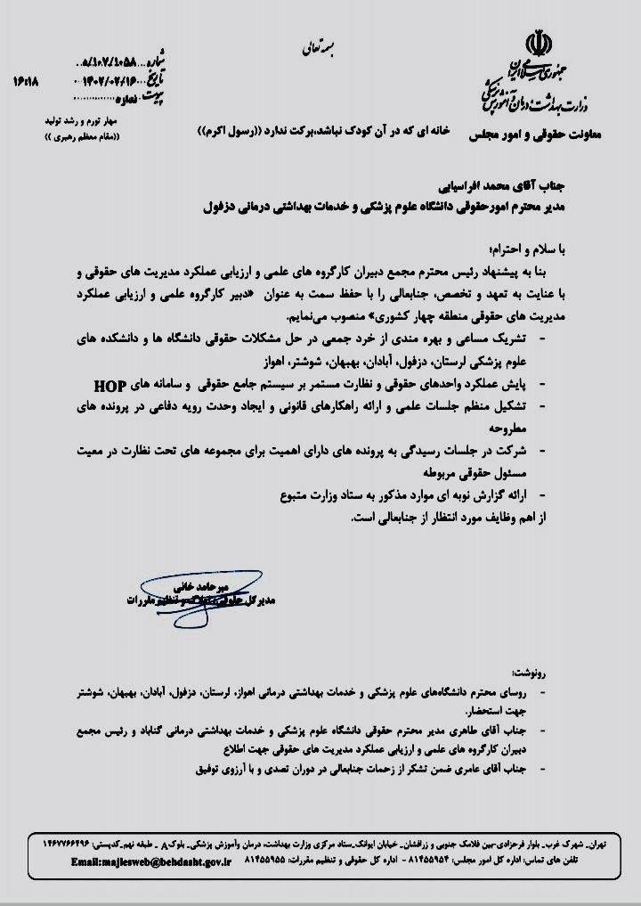 با ابلاغ مدیرکل حقوقی املاک و تنظیم مقرارات وزارت بهداشت دکتر افراسیابی بعنوان دبیر کارگروه علمی و عملکرد مدیریت های حقوقی منطقه چهار کشوری منصوب شد.