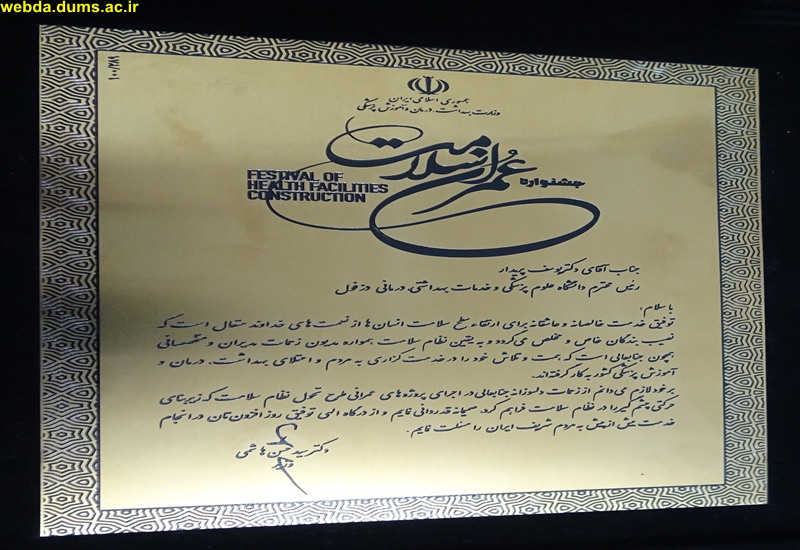 در بخشی از این لوح آمده است برخود لازم میدانم از زحمات دلسوزانه جنابعالی در اجرای پروژه های عمرانی طرح تحول نظام سلامت که زیر بنای حرکتی چشم گیر را در نظام سلامت فراهم کرد، صمیمانه قدر دانی کنم.
