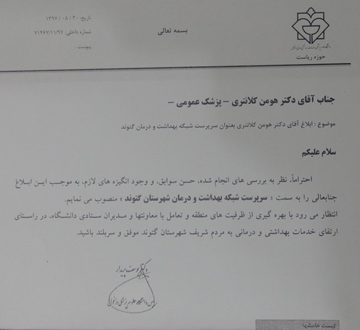 با ابلاغ رئیس دانشگاه علوم پزشکی دزفول دکتر هومن کلانتری بعنوان سرپرست شبکه بهداشت و درمان شهرستان گتوند منصوب شد.
