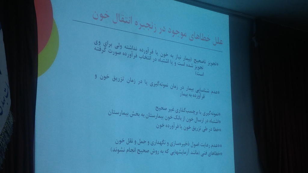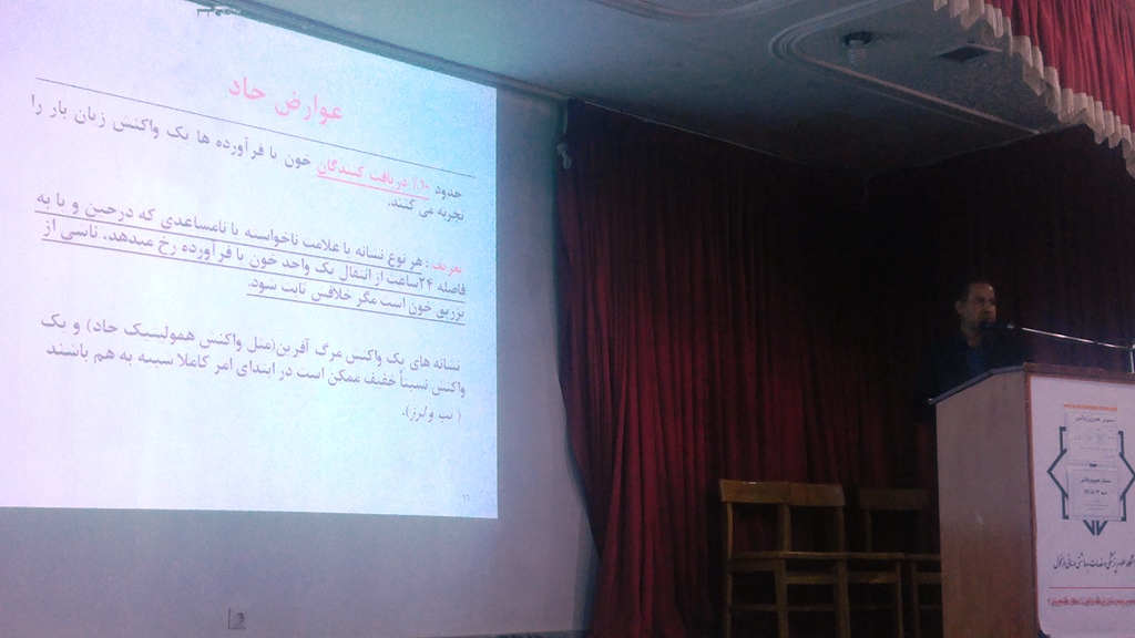 دکترحبیب حبیبی مقدم پاتولوژیست ومسول فنی آزمایشگاه بیمارستان بزرگ دزفول:باتعریف هموویژلانس که همانمراقبت ازدریافت کنندگان خون وفراورده های خونی است دررابطه باعوارض ناخواسته ناشی ازانتقال خون مطالبی بیان کرد.وی به بیان اهداف اجرای هموویژلانس،تاریخچه آن درایران وجهان،پرداخته ودرزمینه آشنایی باانواع فراورده های خونی ونحوه نگهداری آنها،اندیکاسیونها وعلائم اختصاری توضیحات کاملی بانمایش اسلاید ارائه نمود.