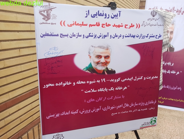 طرح شهید حاج قاسم سلیمانی به منظور مدیریت و کنترل اپیدمی کووید -۱۹ به شیوه محله و خانواده محور با شعار هر خانه یک پایگاه سلامت با مشارکت فرمانداری ویژه، سازمان هلال احمر، شهرداری، آموزش و پرورش و کمیته امداد از امروز در شهرستان دزفول آغاز شد.