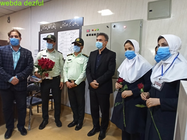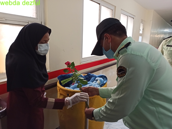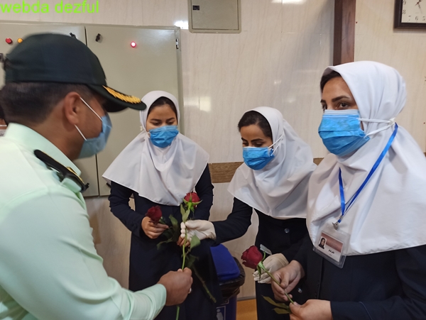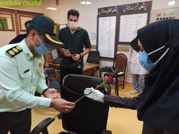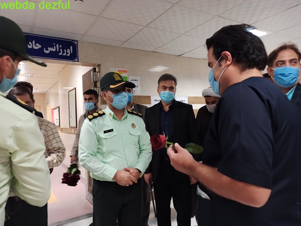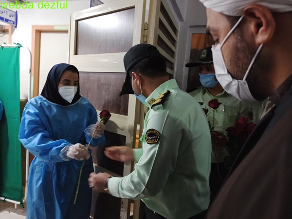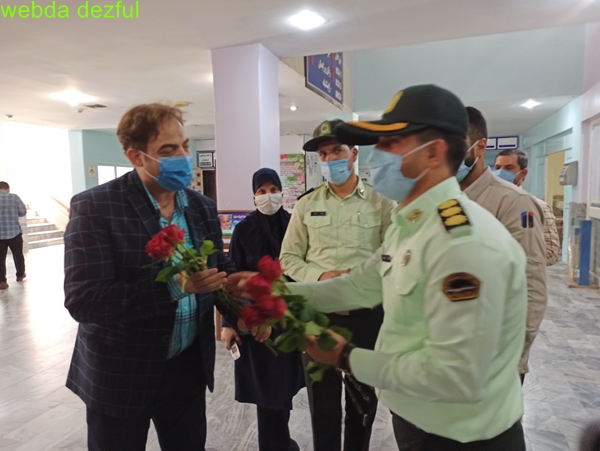 به گزارش خبرنگار وبدا، فریدون جعفریان فر گفت: مقارن ظهر امروز جناب سرهنگ روح الله گراوندی و هیات همراه در بیمارستان بزرگ دزفول حضور یافت و با اهدای شاخه گل به کارکنان  بیمارستان از زحمات مدافعان سلامت تقدیر کرد. سرهنگ گراوندی خدمات مدافعان سلامت را بویژه در شرایط کرونا برجسته دانست و هدف از حضور خود را گرامیداشت یاد شهدای مدافع سلامت و ارج نهادن به کادر درمان دانست. دکتر علی قمیشی رئیس دانشگاه علوم پزشکی دزفول نیز متقابلا از حضور فرمانده نیروی انتظامی و هیات همراه تقدیر و تشکر کرد.در این برنامه دکتر احمدرضا سلمان پور رئیس بیمارستان، دکتر روان پور معاون درمان بیمارستان و زینب آیت مترون بیمارستان بخشی از خدمات کادر درمان را تشرح کردند.