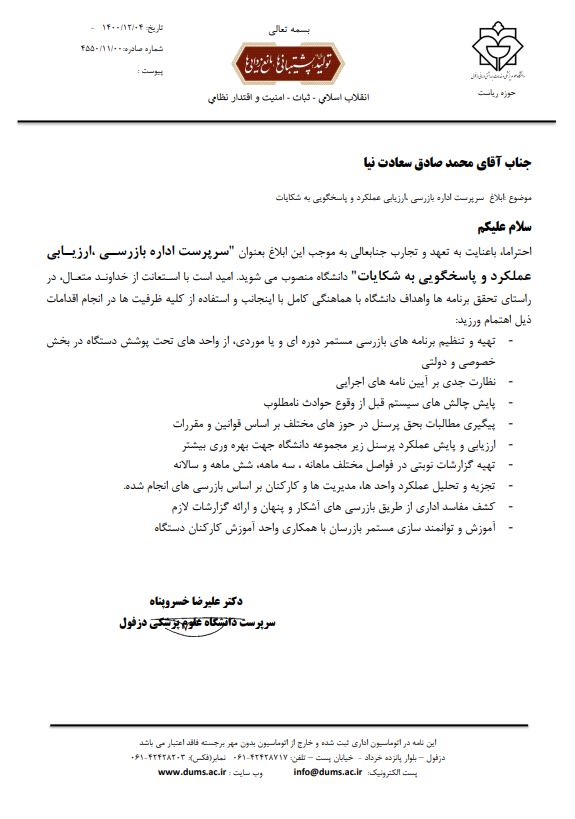 با ابلاغ رئیس دانشگاه علوم پزشکی دزفول محمد صادق سعادت نیا به سرپرستی اداره بازرسی عملکرد و پاسخگویی به شکایات منصوب شد.