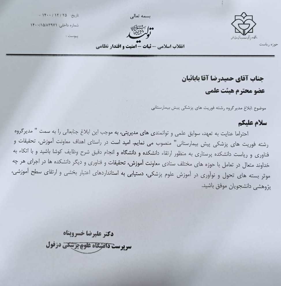 با ابلاغ رئیس دانشگاه علوم پزشکی دزفول مدیر گروه رشته فوریت های پزشکی پیش بیمارستانی منصوب شد.