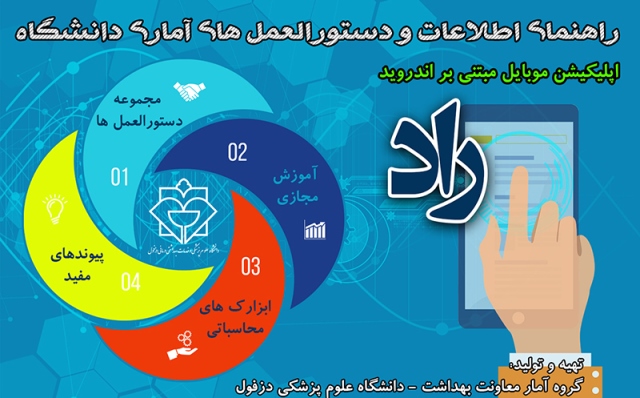 پس از آن با حضور کارشناسان آمار از اپلیکیشن موبایل راهنمای اطلاعات و دستورالعملهای آماری "راد" رونمایی شد. این پروژه مبتنی بر سیستمعامل اندروید می باشد که با امکاناتی شامل کتابچه دستورالعملها و قوانین، ابزارکهای محاسباتی و بخشهای آموزشی به همت گروه آمار معاونت بهداشت دانشگاه علوم پزشکی دزفول (خانم ها افشارنیا، نورآبادی و دکتر مهدی خلفه نیلساز) تولید گردیده است.