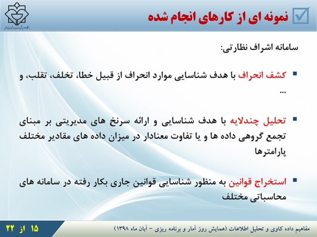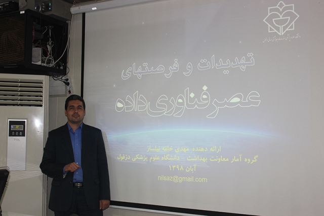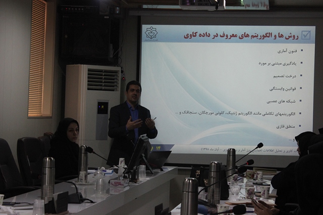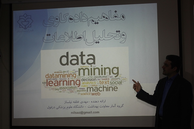 در ادامه کارگاه مفاهیم دادهکاوی و تحلیل اطلاعات توسط دکتر خلفه نیلساز برگزار شد. در این کارگاه ابتدا مفاهیم علم دادهکاوی، اهمیت و کاربردهای آن تشریح شد. دکتر خلفه نیلساز با بیان نمونههایی از فعالیتهای انجامگرفته، در این کارگاه گفت: دادهکاوی یعنی استخراج اطلاعات گرانبها از حجم عظیم منابع داده. وظیفهی دادهکاوی، کاویدن و استخراج دانش از منابع عظیم داده است تا اطلاعات گرانبهایی که در حجم انبوهی از اطلاعات سطحی پنهان شده است را آشکار سازد. تفاوت اصلی دادهکاوی و علم آمار، در حجم دادههای مورد تحلیل، روش مدلسازی دادهها و استفاده از هوش مصنوعی است. دادهکاوی شاخهی توسعهیافته و پیچیدهی علم آمار است.