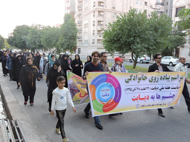به مناسبت گرامیداشت هفته ملی دیابت ، همایش پیاده روی خانوادگی عمومی در تاریخ 02/09/1395ساعت 4 عصر توسط واحد پیشگیری و مبارزه با بیماری های مرکز بهداشت دزفول و با همکاری اداره ورزش شهرستان در محل بلوار پیام آوران دزفول برگزار گردید.