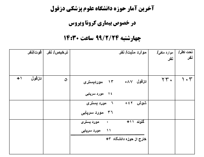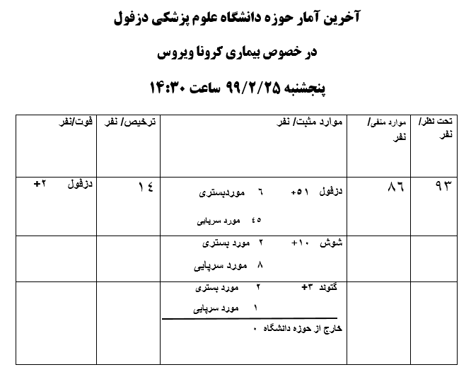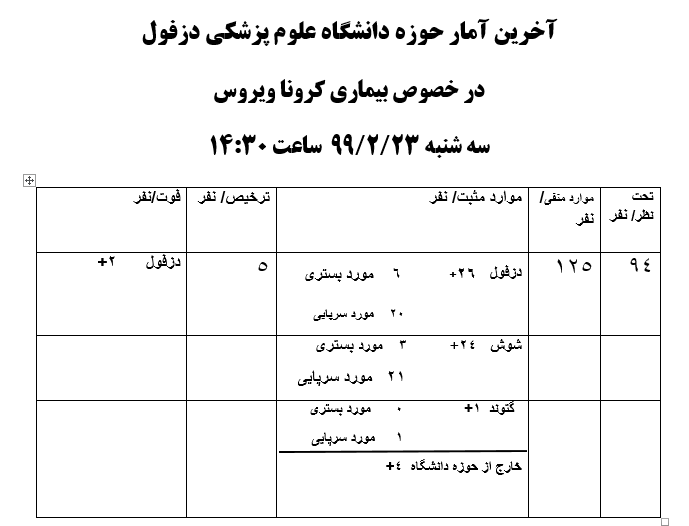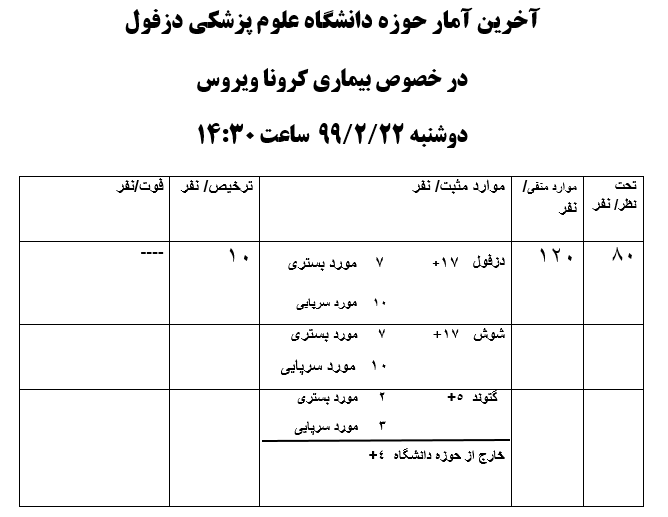 آمار حوزه دانشگاه علوم پزشکی دزفول در خصوص بیماری کرونا 22 لغایت 25 اردیبهشت ماه