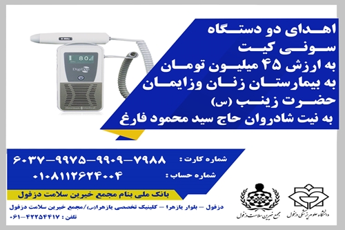 مدیرعامل مجمع خیرین سلامت دزفول اعلام کرد:  دو دستگاه سونی کیت به ارزش ۴۵ میلیون تومان به نیت شادروان آقای حاج سیدمحمود فارغ  به  بیمارستان زنان و زایمان حضرت زینب (س) اهدا شد