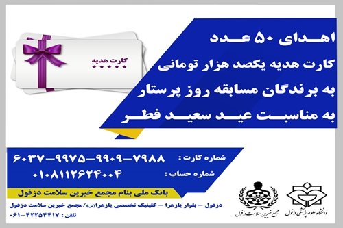 به گزارش روابط عمومی مجمع خیرین سلامت دزفول به میمنت عید سعید فطر به ۵۰ نفر از برگزیدگان مسابقه پیامکی پویش اهدای ۵۵۵ بسته معیشتی به بیماران خاص نیازمند که به مناسبت میلاد حضرت زینب (س) و روز پرستار برگزار شده بود به قید قرعه کارت هدیه یکصد هزار تومانی اهدا شد.