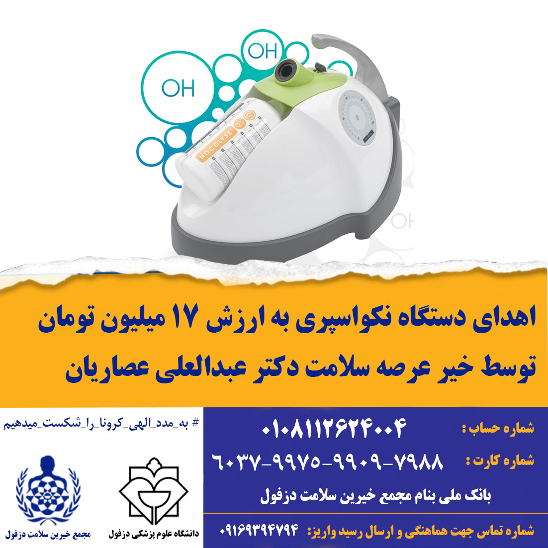 مدیر عامل مجمع خیرین سلامت دزفول اعلام کرد : این مجمع با حمایت خیرعرصه سلامت آقای دکتر عبدالعلی عصاریان یک دستگاه نکو اسپری ضدعفونی کننده سطوح و محیط مخصوص بخش های حاد تنفسی به ارزش 174میلیون ریال به بیمارستان بزرگ دزفول( گنجویان) اهدا نمود.