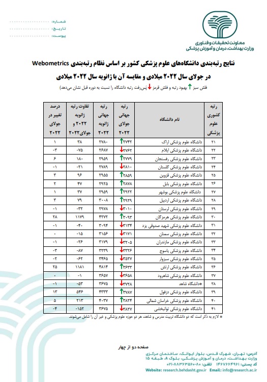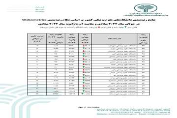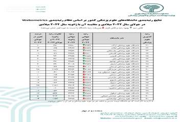 به گزارش وبدا به نقل از روابط عمومی معاونت آموزش، حوزه مدیریت تحقیقات و فناوری دانشگاه، براساس نتایج رتبه بندی دانشگاه های علوم پزشکی کشور در ماه جولای ۲۰۲۲تیر۱۴۰۱ بر طبق نظام رتبه بندی جهانی وبومتریکس، که بر مبنای ارزیابی تولیدات آموزشی و پژوهشی دانشگاه ها از طریق وب سایت های دانشگاهی می باشد براساس سه شاخص، شامل شاخص مشاهده پذیری سایت دانشگاه با وزن ۵۰ درصد، تعداد استنادات به مقالات با وزن ۱۰ درصد و تعداد مقالات کیفی پراستناد دانشگاه با وزن ۴۰ درصد انجام می شود.