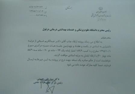 طی حکمی مرتبه علمی "دکتر عبدالکریم شیخی" معاون پژوهشی دانشگاه علوم پزشکی دزفول از دانشیاری به رتبه استاد تمام ارتقاء یافت. وی دارای دکترای تخصصی (PhD) ایمونولوژی بالینی از دانشکده پزشکی دانشگاه علوم پزشکی شیراز و فلوی تحقیقاتی از دانشگاه کویینز کانادا می باشد. او از سال 1371 تا 1389 بمدت 18 سال عضو هیئت علمی (دانشیار) دانشگاه علوم پزشکی زنجان انجام وظیفه نمود و با توجه به اینکه از دانشگاههای مختلفی چون دانشگاه علوم پزشکی ایران، انستیتو رازی، دانشگاه علوم پزشکی اهواز و دانشگاه کویینز کانادا دعوتنامه برای انتقال و همکاری داشت ولی بعلت نیاز دانشگاه علوم پزشکی زنجان در آنجا باقی ماند تا اینکه در سال 1389 همزمان با تاسیس دانشکده علوم پزشکی دزفول و به دعوت مسئولین وقت، موافقت رییس دانشگاه علوم پزشکی زنجان را  برای انتقال به زادگاهش را  کسب نمود. تلاش او از فروردین سال 1388 پس از انجام کارهای تحقیقاتی متعدد در شیراز، زنجان، آلمان و کانادا و تدریس دانشجویان PHD و فوق لیسانس و دانشجویان پزشکی، داروسازی، دندانپزشکی، پیراپزشکی و پرستاری و مامایی باعث شد تا از وزیر وقت وزارت بهداشت درمان و آموزش پزشکی ارتقاء علمی  و دریافت مرتبه دانشیاری گردد. از آن پس به تحقیقات و تدریس دانشجویان دانشگاههای زنجان، دزفول، اهواز و آبادان ادامه داد و در دزفول موفق به تاسیس آزمایشگاه تحقیقاتی ایمونولوژی سلولی-مولکولی، تاسیس کمیته تحقیقات دانشجویی، پایه ریزی مرکز تحقیقاتی-درمانی ناباروری ام البنین و انتشار مقالات علمی در مجلات بین المللی دنیا شد. و در نهایت معاون پژوهشی دانشگاه علوم پزشکی دزفول موفق شد طی حکمی در دی ماه سال 95 به مرتبه استاد تمام نائل گردد.