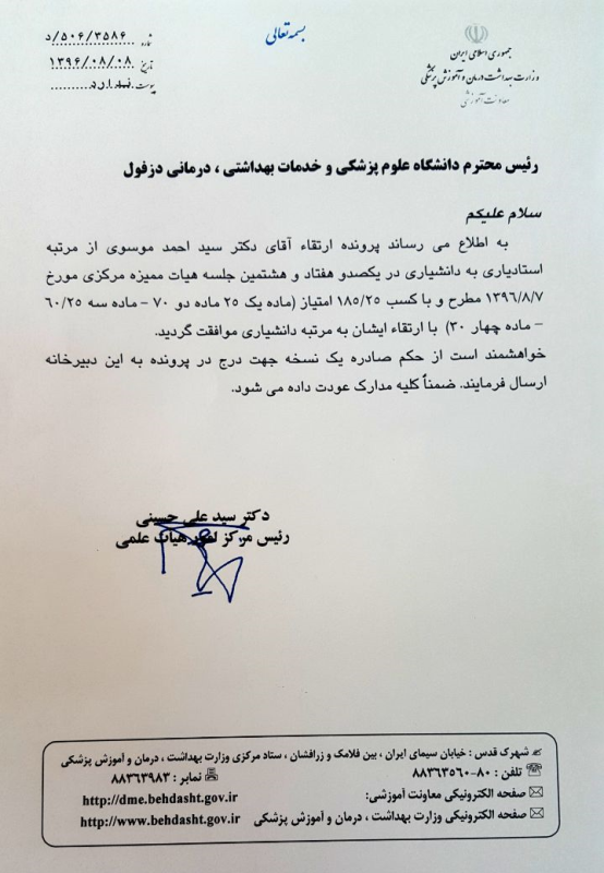 دکتر سید احمد موسوی استادیار دانشگاه علوم پزشکی دزفول به رتبه دانشیاری ارتقا یافت طی ابلاغی که از طرف مرکز امور هیات علمی ارسال شده آمده است بر اساس نشست یکصد و هفتادمین جلسه با کسب 185/25 امتیاز به مرتبه دانشیاری موافقت بعمل می آید