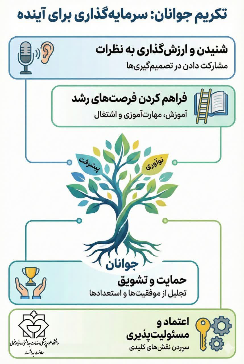روابط عمومی معاونت بهداشت دانشگاه علوم پزشکی دزفول تکریم جوانان 1404/11/18 - 08:43 - تعداد بازدید: 17 - کد خبر : 20196 - گروه خبری : اخبار معاونت بهداشتی,جوانی جمعیت - تعداد نظرات : 0 هفته ملی جوان ۱۱ لغایت ۱۷ بهمن ۱۴۰۴ به شما توصیه میکنم که به جوانان توجه و عنایت خاص نمایید و در مورد آنان به بهترین وجه رفتار کنید. (پیامبر اکرم ص)